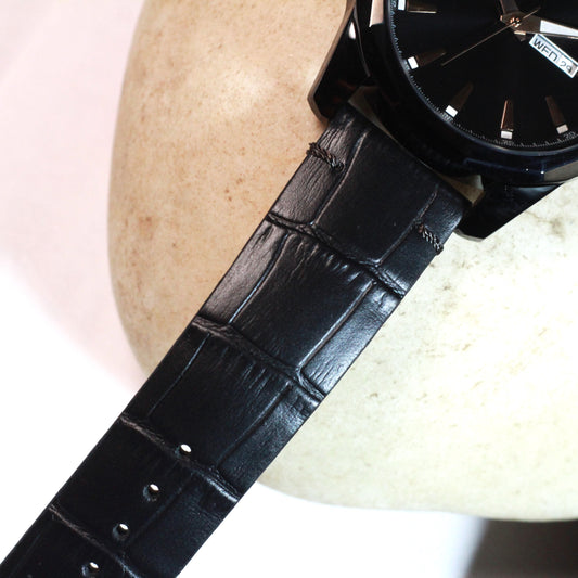 Black Heavy look watch for men with luminous hands and markers :day and date in black leather