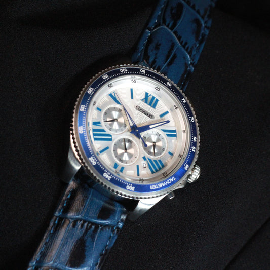 Men chronograph watch Blue jacquard padded strap and silver dial functions included : tachymeter