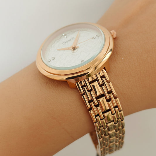 WOMENROSE GOLD WATCH WITH EMBOSSED TRADITIONAL PATTERN IN PEARL WHITE DIAL