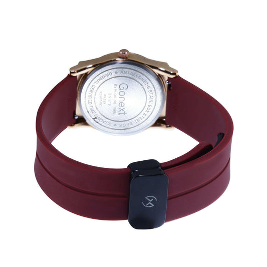 Unisex large dial watch with magnetic closure in rose gold case with wine color strap