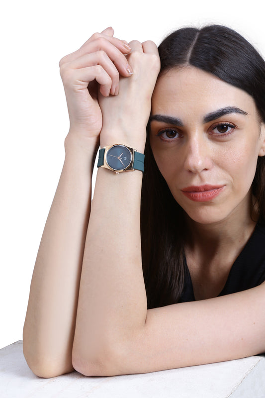 Unisex large dial watch with magnetic closure in rose gold case with green strap and dial