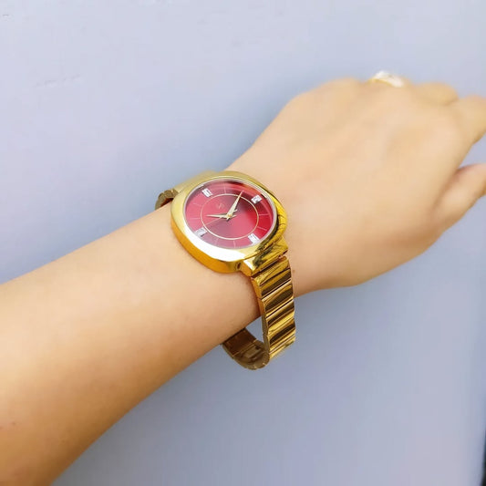Minimalist and trendy maroon dial watch with gold rectangular link chain perfect for office and daily wear