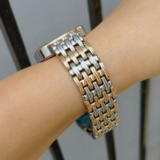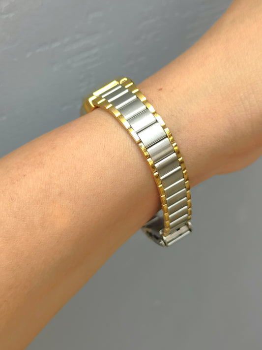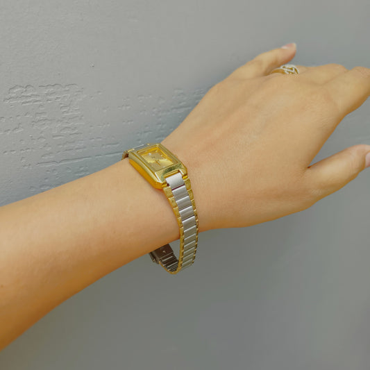 Sleek light weight vintage watch in steel and gold with gold embellished dial for office wear