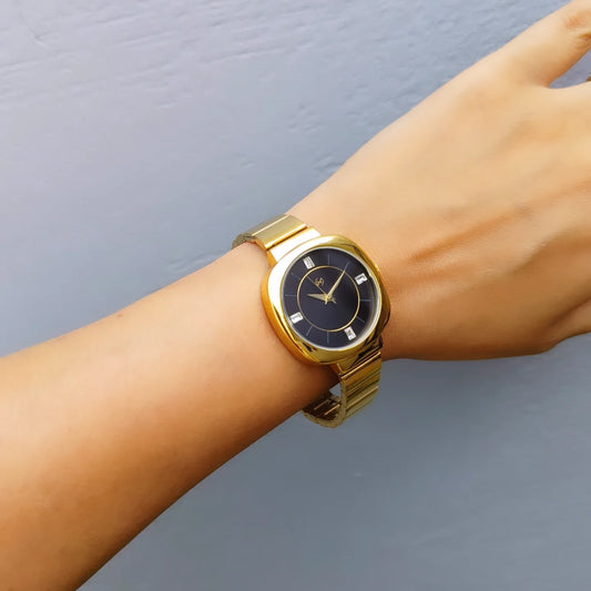 Sleek light weight vintage watch in steel and gold with black embellished dial for office wear