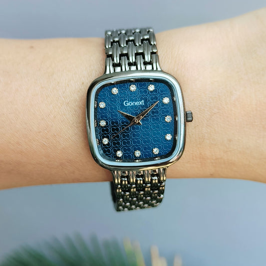 Armani Inspired Women gun metal grey colored watch in deep blue dial with Butterfly lock