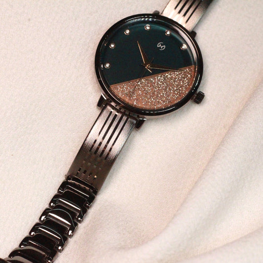 Dual tone shimmering green dial with jet grey bangle perfect for daily and party wear