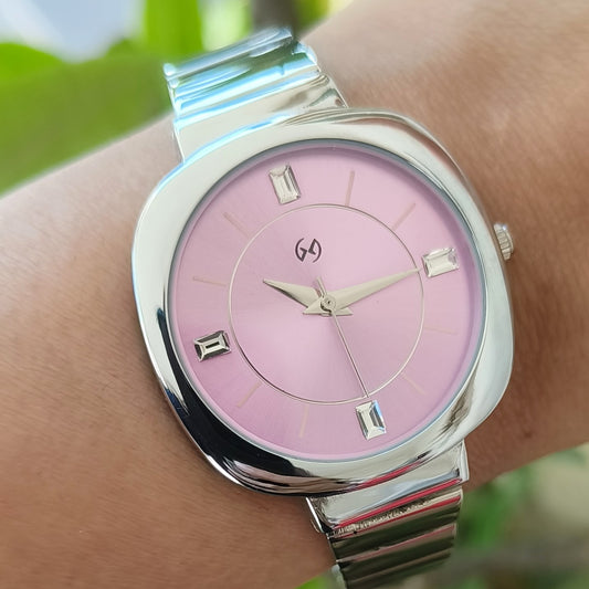 Shiny baby pink dial watch with rectangular link chain in steel perfect for office and daily wear