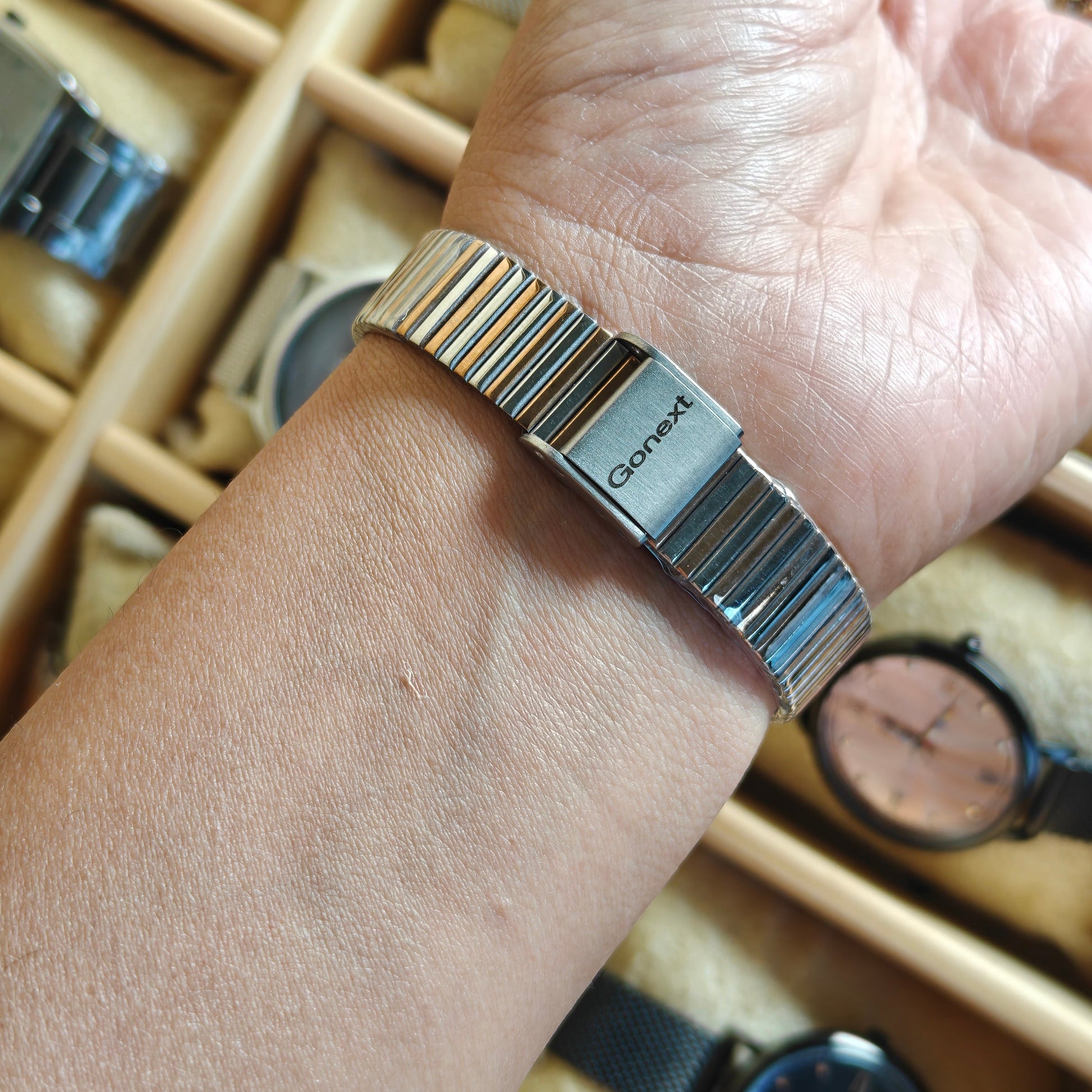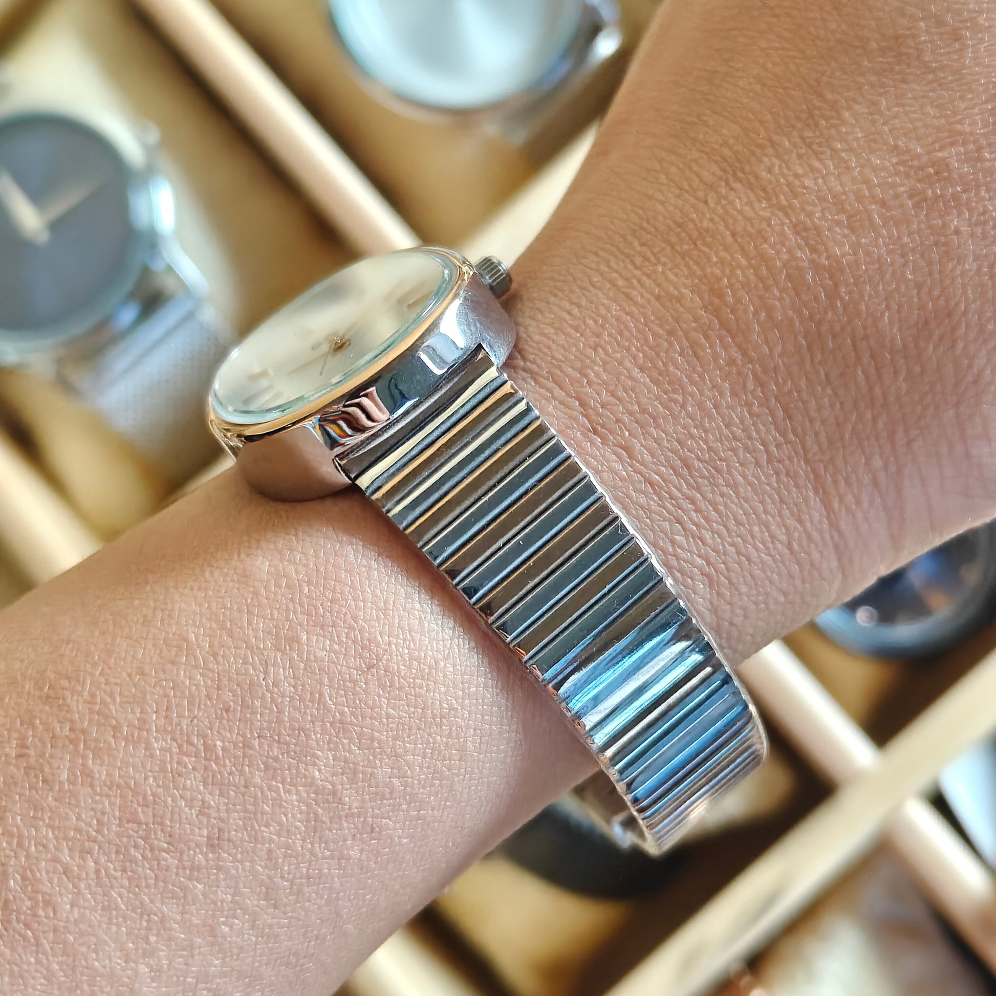 Modern style oval watch with white MOP dial and soft two tone chain self adjustable watch